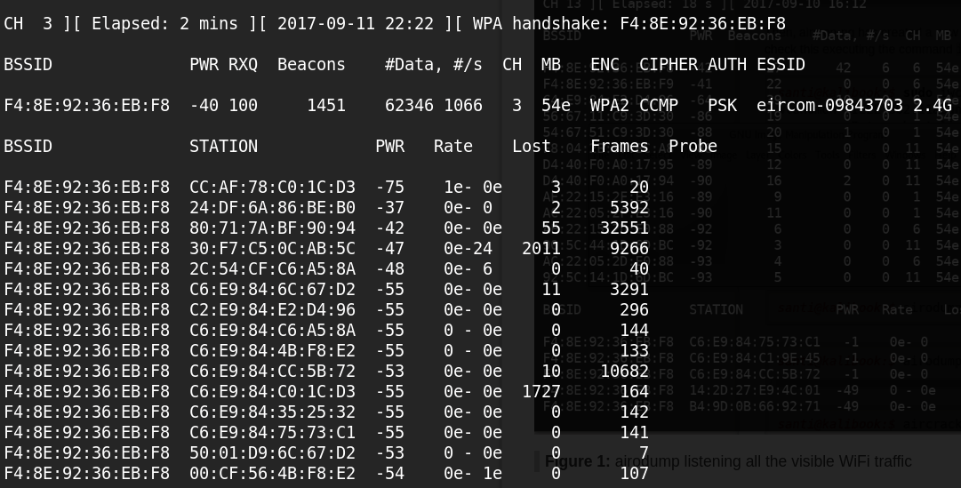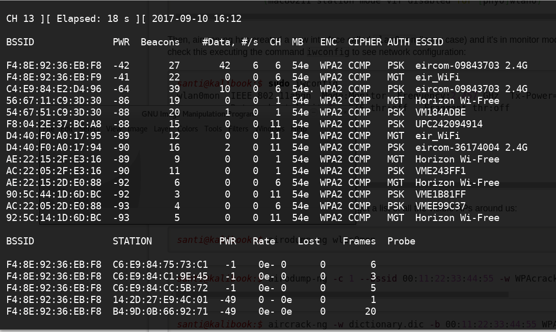 In summary, we will put our WiFi card on monitor mode to listen to all the WiFi traffic around us and then we will get the handshake (it contains the hash of the WiFi password and it is sent in every package between the router and any computer connected to it). Then, you will try to crack to get the password or we will try to get it by bruteforce with a dictionary in the case we couldn't crack it (if the WiFi connection uses WPA/WPA-2-PSK encryption it is not possible to obtaing the password from the handshake). In that way we will realize how importat is choose the right encryption method and a strong password when we are going to set up our Wifi connection.