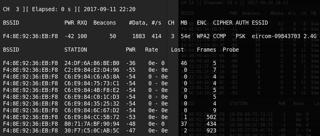 santi@kalibook:$ airodump-ng -c 1 --bssid F4:8E:92:36:EB:F8 -w WPAcrack wlan0mon --ignore-negative-one